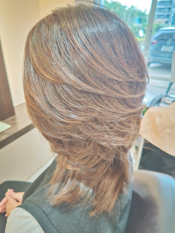 レイヤーをしっかり入れることで、髪の毛が自然に動き、軽やかな印象に仕上がります。特に後ろ姿が美しく見えるので、オフィスでもプライベートでも好印象まちがいなしです。